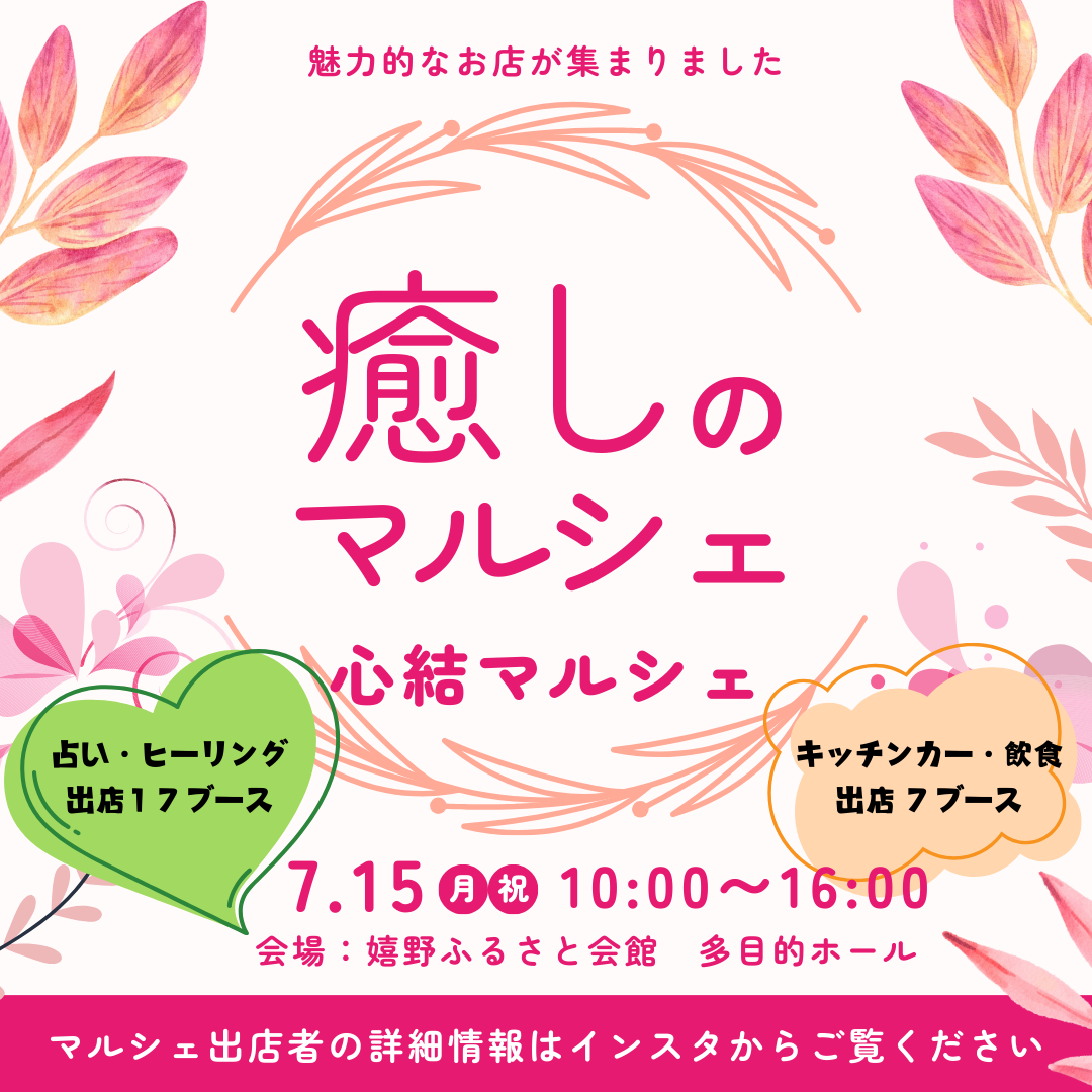◆︎◇︎◆︎◇︎◆︎◇︎◆︎◇︎◆︎◇︎, , 今年も開催します‼️, , \占いと癒しのマルシェ , , 🔮占いブースがずらり!,ヒーリング・ボディーケアなど癒し, こだわりのキッチンカーや飲食ブースなど, , 全26ブース, ,心結マルシェ , ,日時:7月5日 土 , 10時〜16時, 会場:嬉野ふるさと会館,松阪市嬉野町 , ,。