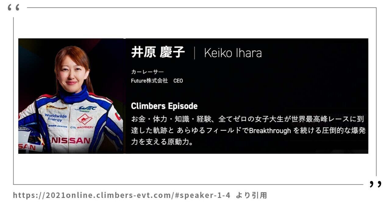 Day2 井原 慶子 さんカーレーサ―@Climber2021 での学びまとめ速報<1>リョーサクライマホラクリエイティブ代表個人note。