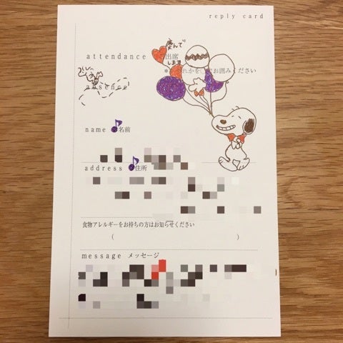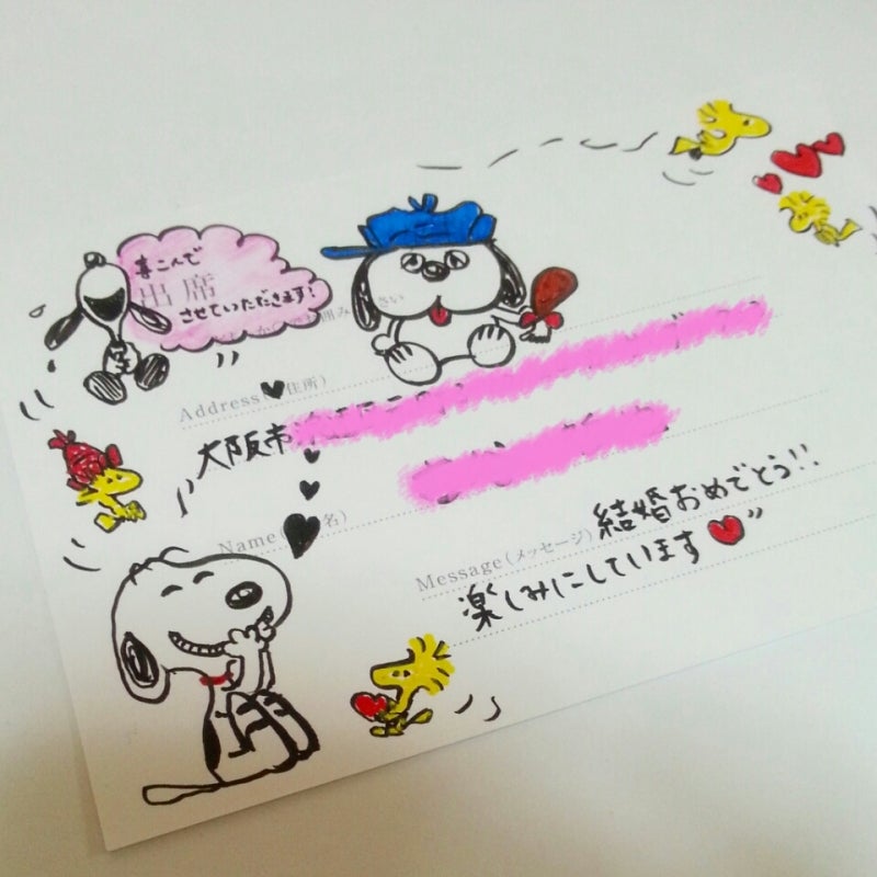 結婚式招待状の返信ハガキにスヌーピー♡*zunko* 〜北欧マリメッコのハンドメイドとネイルといろいろ。