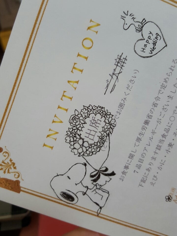 こめこぱん * on X: "スヌーピー好きなトモダチへ♡ 一生懸命描いたけど、渡した相手からは何も反応なく 悲しいかな。招待状アート自己満スヌーピーSNOOPY手書きイラスト結婚式披露宴 https:t.co bgVDFqKZlw"X。