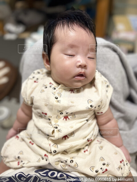 膝の上で寝ている赤ちゃんの写真・画像素材-Snapmart スナップマート。