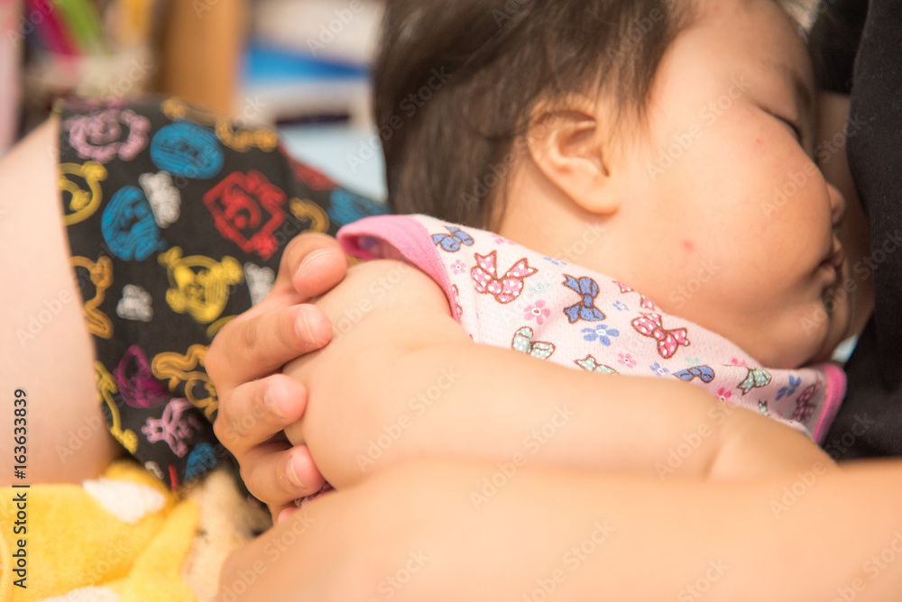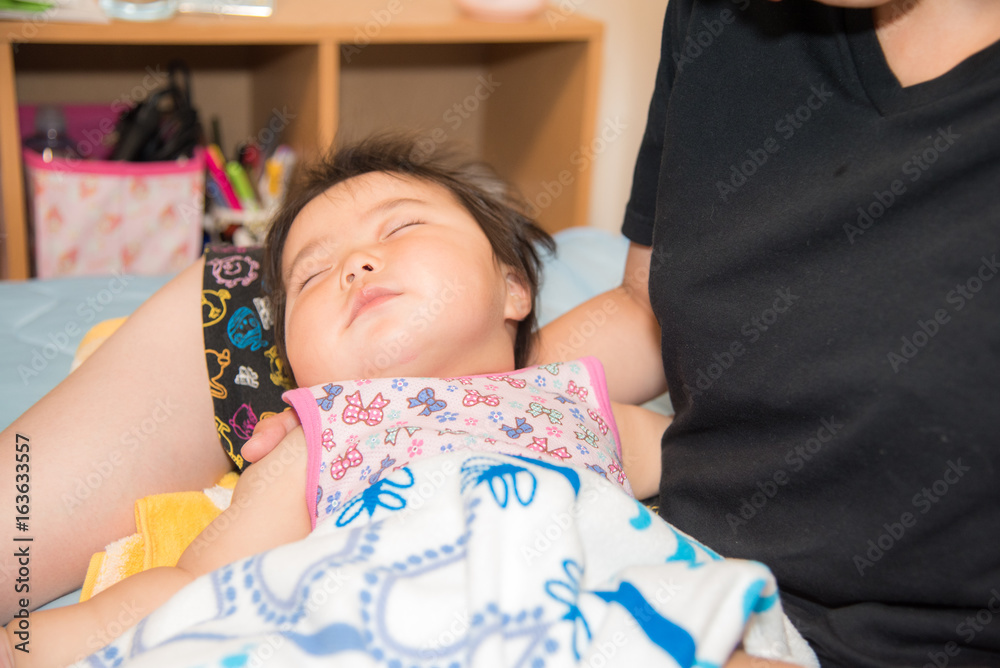 ママの膝の上で寝る赤ちゃん の Stock フォトAdobe Stock。