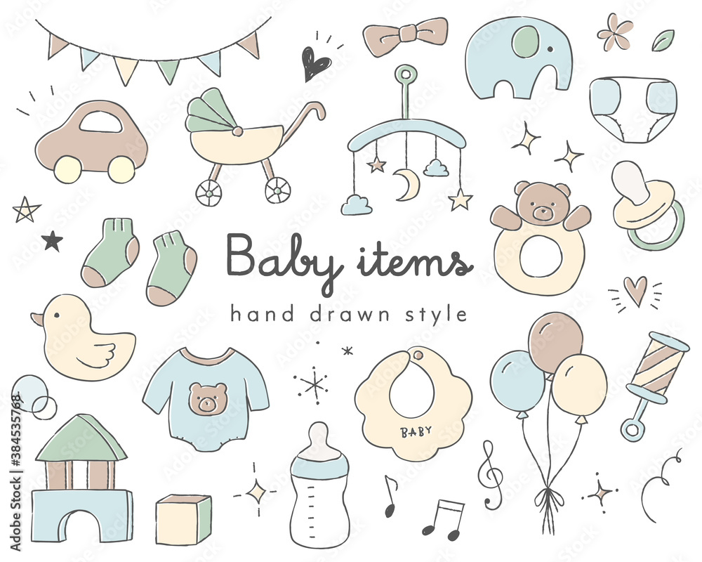 Vetor do Stock かわいい赤ちゃんアイテムの手描きイラストのセット ベビー おもちゃ こども グッズ 子育て 新生児AdobeStock。