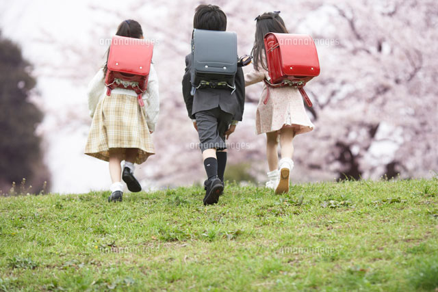 ランドセルを背負う小学生の後姿と桜 02266016038C の写真・イラスト素材アマナイメージズ。