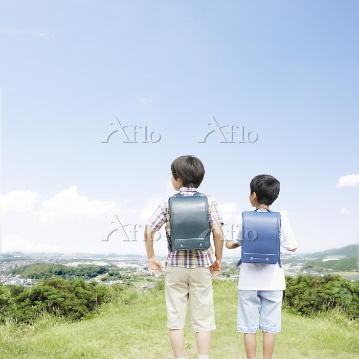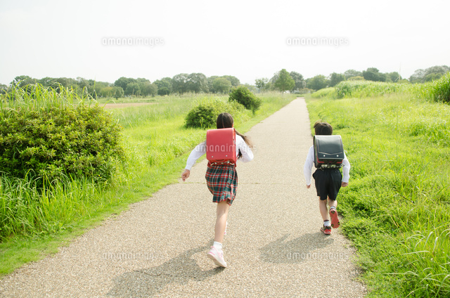 ランドセルを背負って走る小学生2人の後ろ姿 10568002247 の写真・イラスト素材アマナイメージズ。