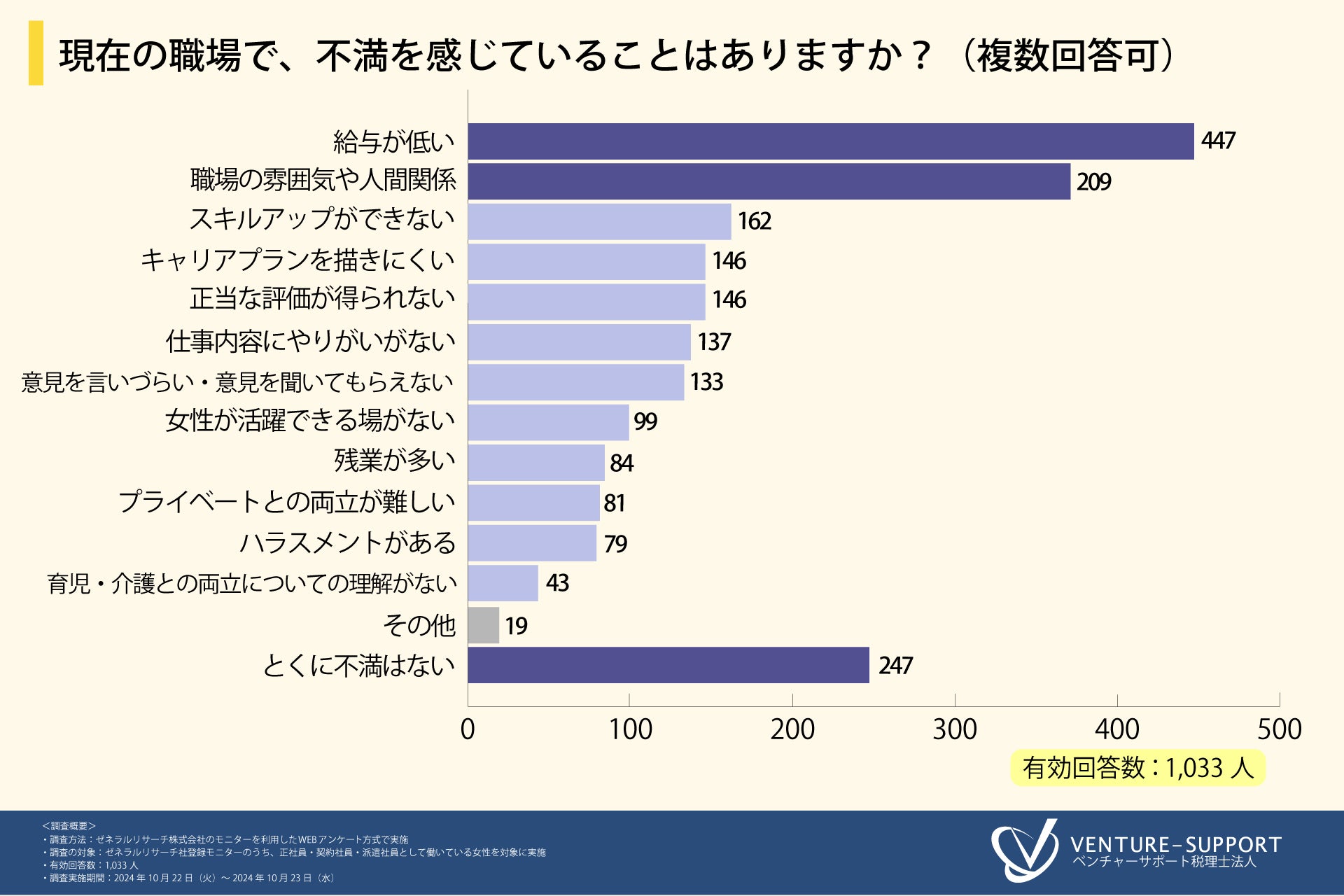 働く女性のキャリアビジョンに関する調査>現在の職場への不満は「給与が低い」が4割超。4割の人が「主任」までの昇進を目指すベンチャーサポートコンサルティング株式会社のプレスリリース。