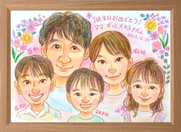 家族の絆を描く感動のギフト 家族 の思い出を一枚の似顔絵に込めてみませんか?記念写真風の特別な似顔絵は、一家に一枚の宝物となります。鮮やかな色使いと手描きの技術は特に女性に人気で、年齢や性別を問わず喜ばれるアイテムです。トップクラスの人気似顔絵作家が。