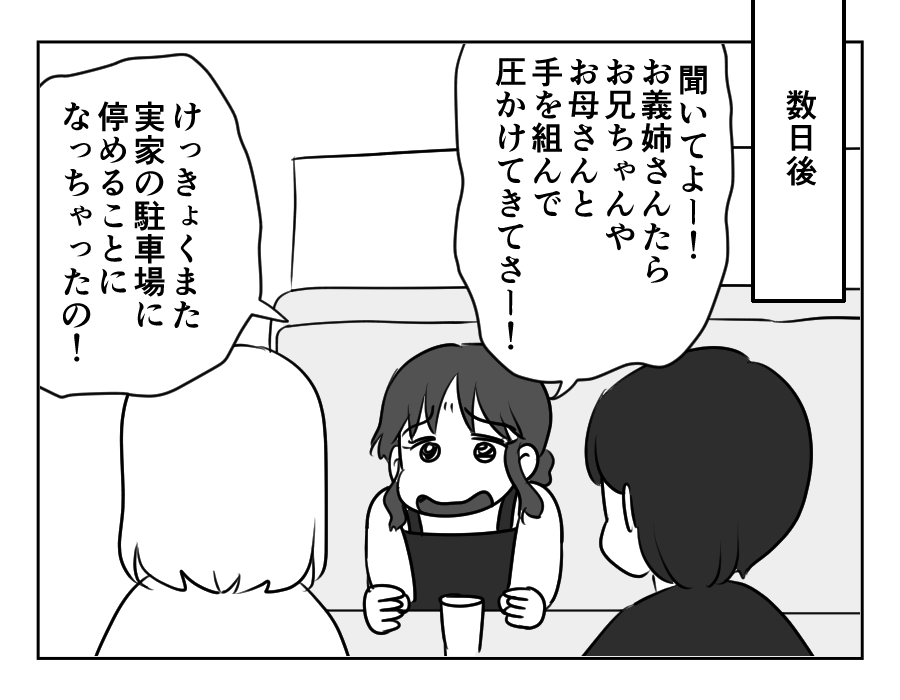 義姉と!駐車場トラブル 義妹のトンデモ発言「パーキング代払ってよ!」<第12話> 4コマ母道場ママスタセレクト。