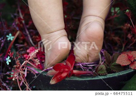 植木鉢に乗って背伸びする赤ちゃんの裸足と足の裏と赤い植物の写真素材66475511- PIXTA。