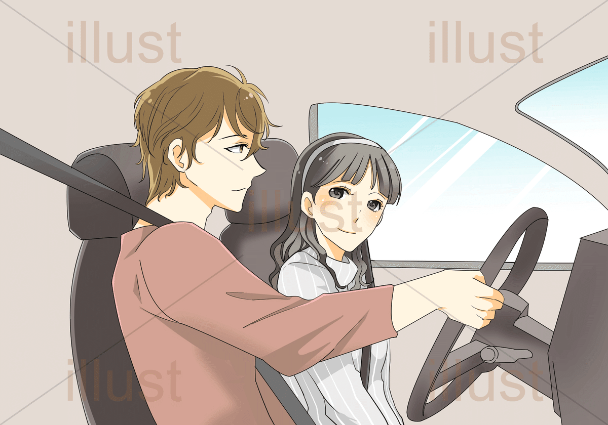 00444-女性から仕掛ける最適なキスするタイミング・ドライブデートで停車中にイチャイチャするカップルのイラストイラストの嗜み。