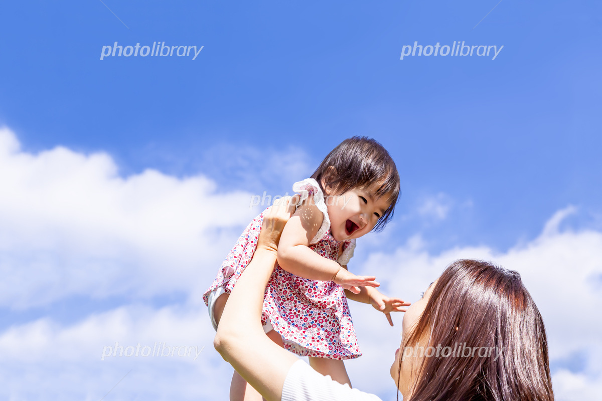 青空の下 赤ちゃんを高い高いをしてあやすお母さん 家族 母子 親子 幸せ 愛 育児 子育てイメージ 写真素材6056225- フォトライブラリ。