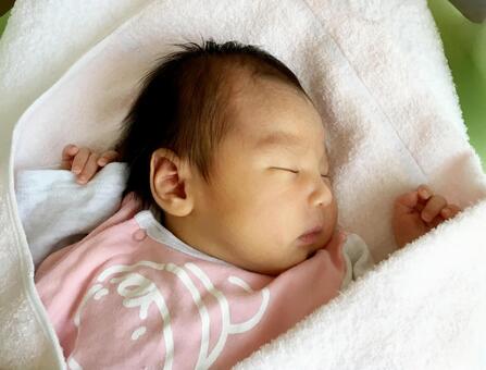 ベビーベッドで寝てる新生児 生後8日目の写真・画像素材-Snapmart スナップマート。