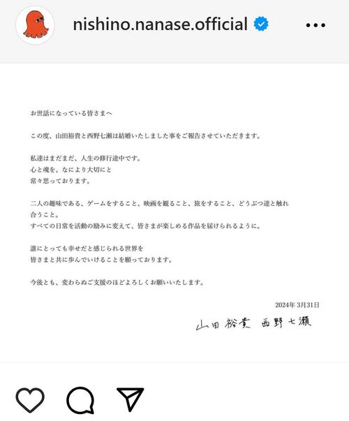 山田裕貴&西野七瀬が結婚発表「私達はまだまだ、人生の修行途中です」 - ライブドアニュース。