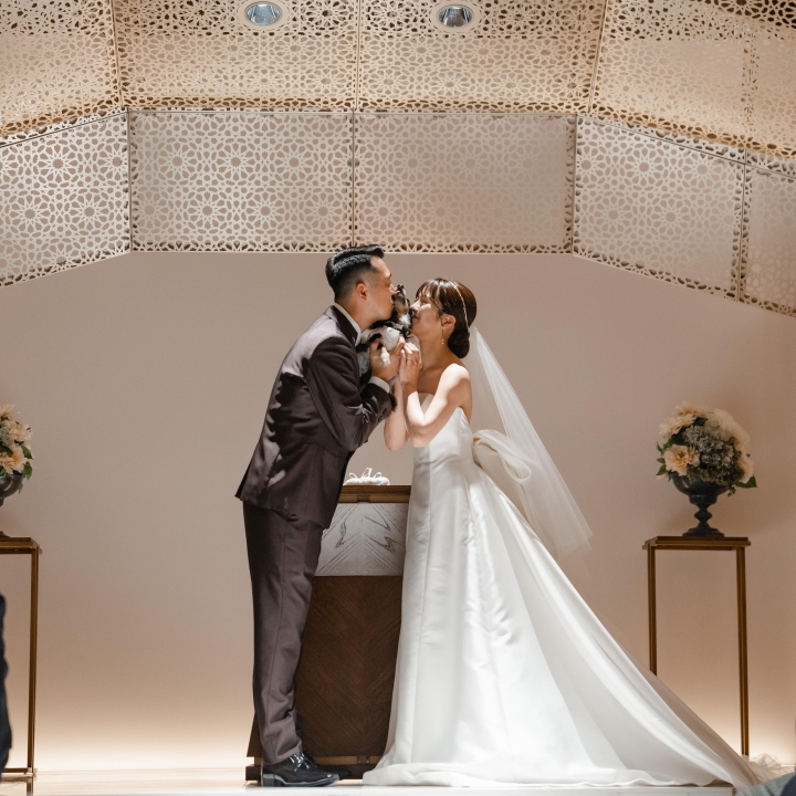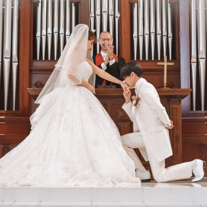 誓いのキス~ 挙式で新郎新婦さまが緊張するシーンのひとつ、誓いのキス。 ちゃんと意味があるのをご存知でしょうか? 誓いの言葉を詠みあげた後にキスをすることで、「永遠の愛の言葉を閉じ込める」というロマンチックな意味があります。恥ずかしいという方は、もちろん。