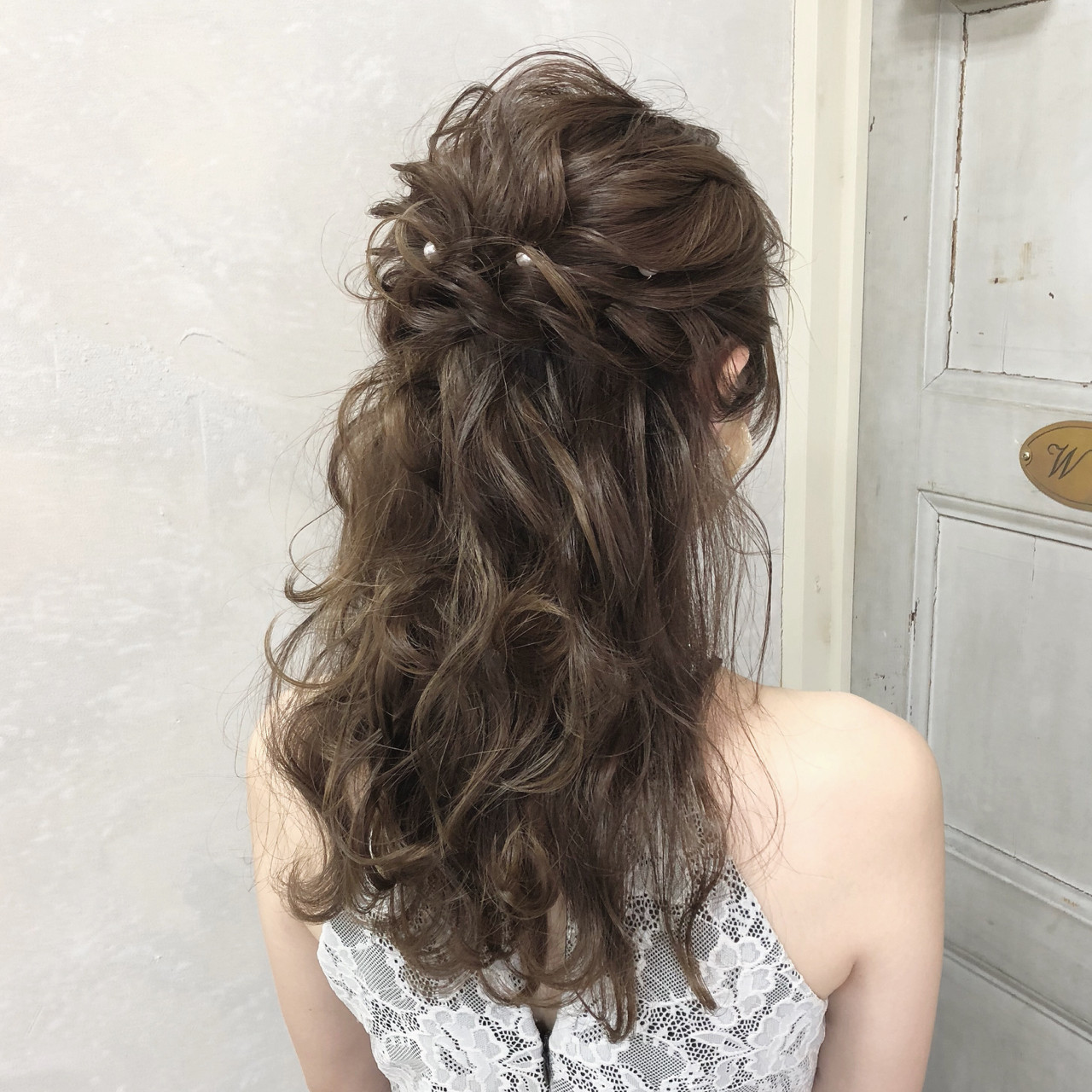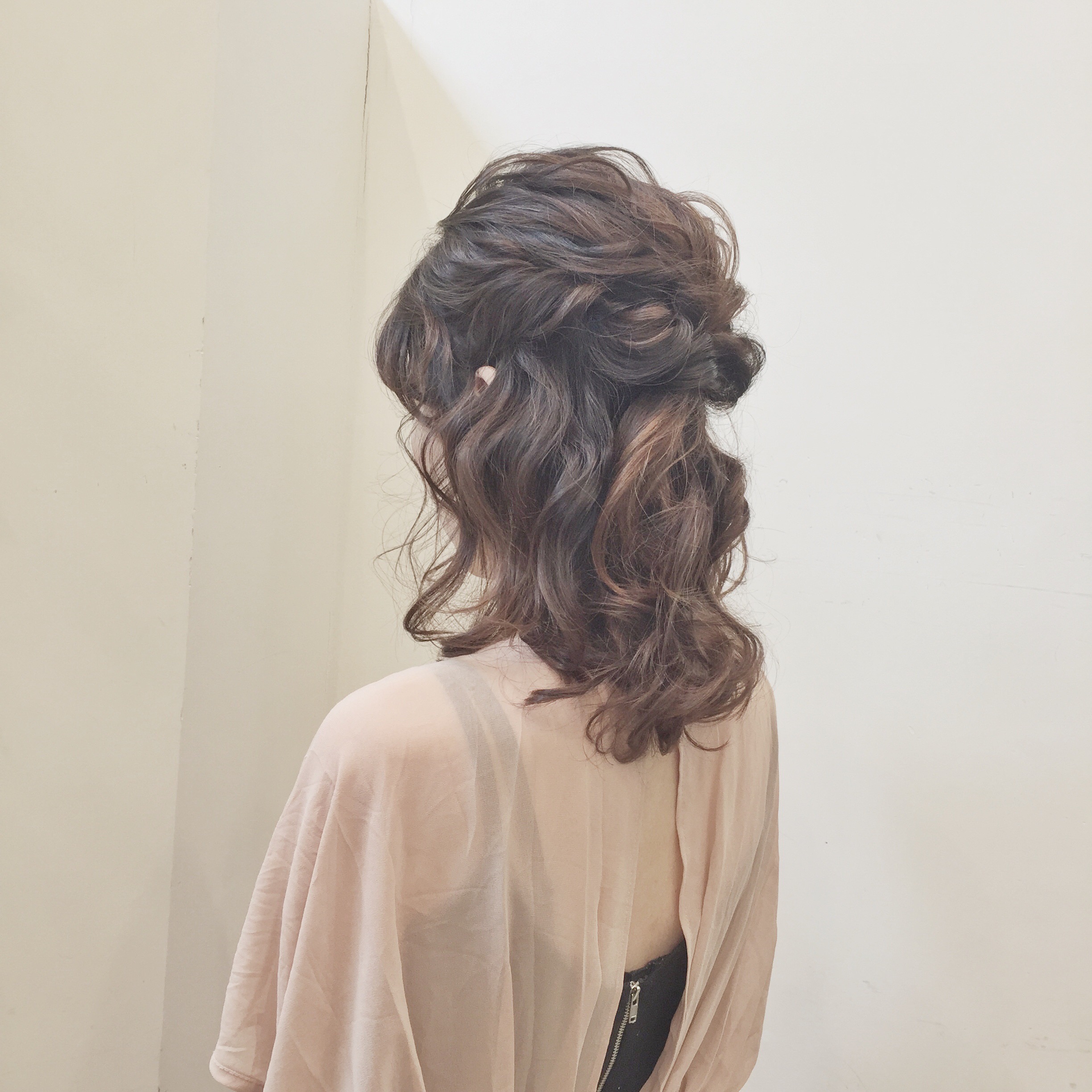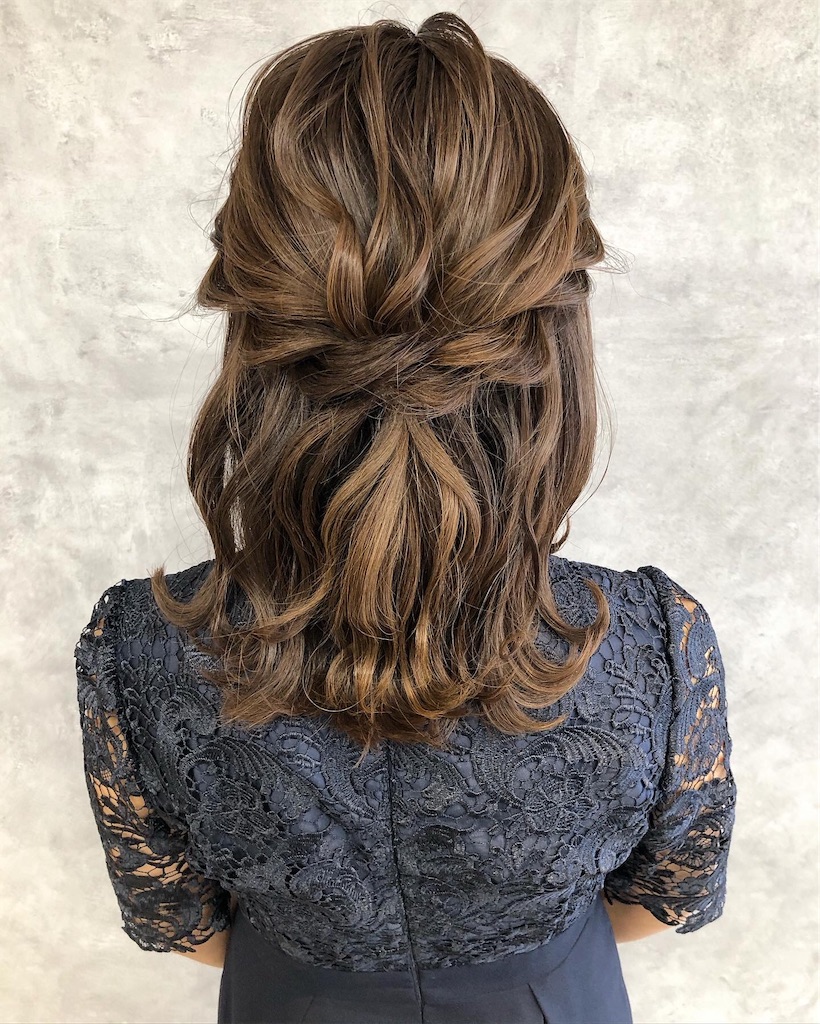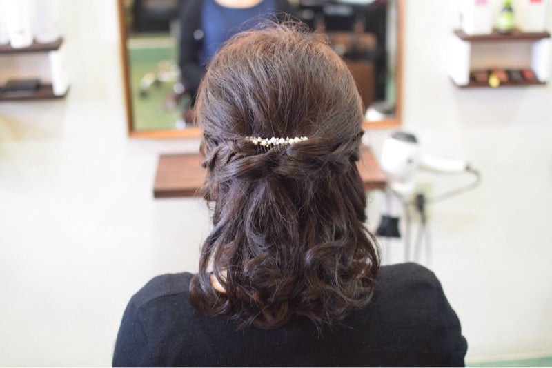 結婚式お呼ばれスタイル。肩くらいのミディアムの長さのハーフアップ。大分県別府市美容室AnuziK アヌジック 一美容師hiroyukiのブログ。