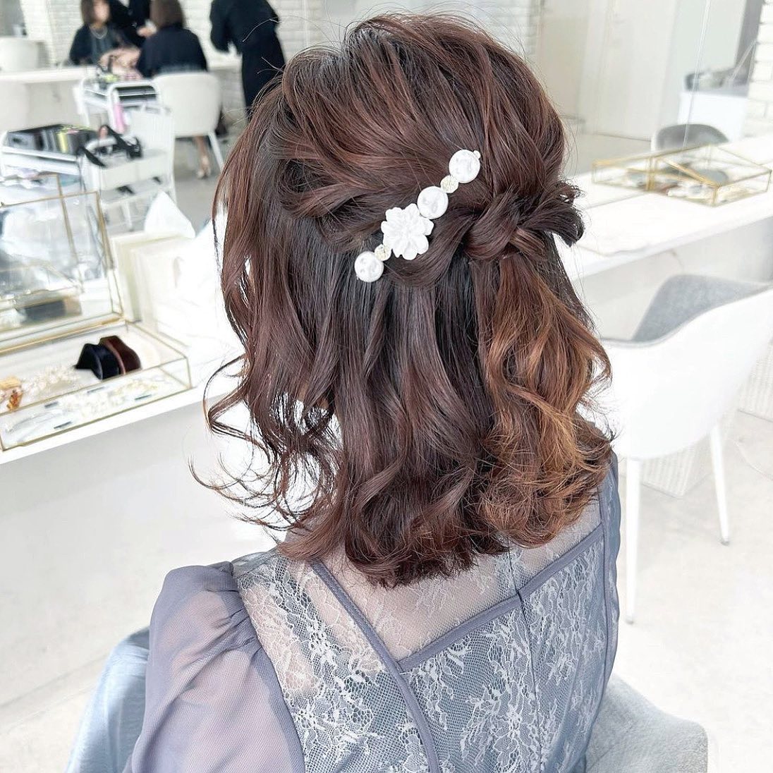 肩ラインのヘアには ハーフアップがお似合いです😆 飾りを付けて 大人可愛いハーフアップの出来上がり✨ハーフアップ ヘアアレンジ アレンジ #結婚式 大人可愛い ヘアスタイルミディアムヘアミディアムヘアアレンジ簡単アレンジ#結婚式お呼ばれ。