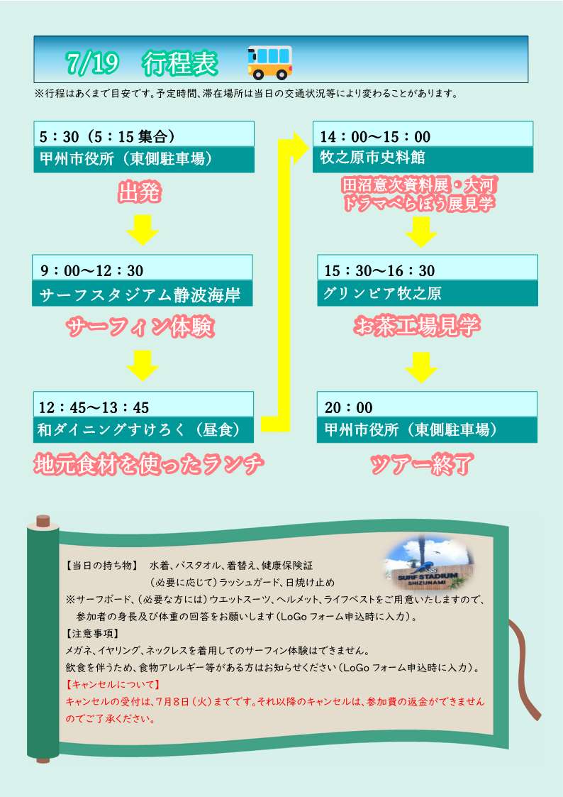 サーフィン体験参加者募集 甲州市×牧之原市 観光交流事業甲州市。