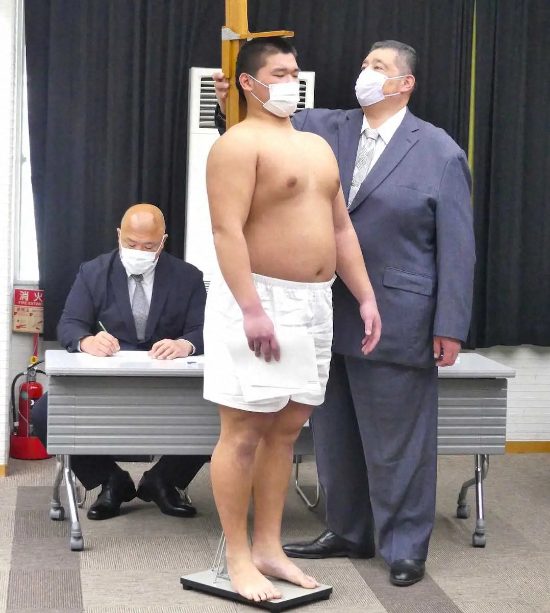 新弟子検査で身長を測定する野田典雅 中央 。左は師匠の藤島親方 撮影・前川 晋作- スポニチ Sponichi Annex スポーツ。