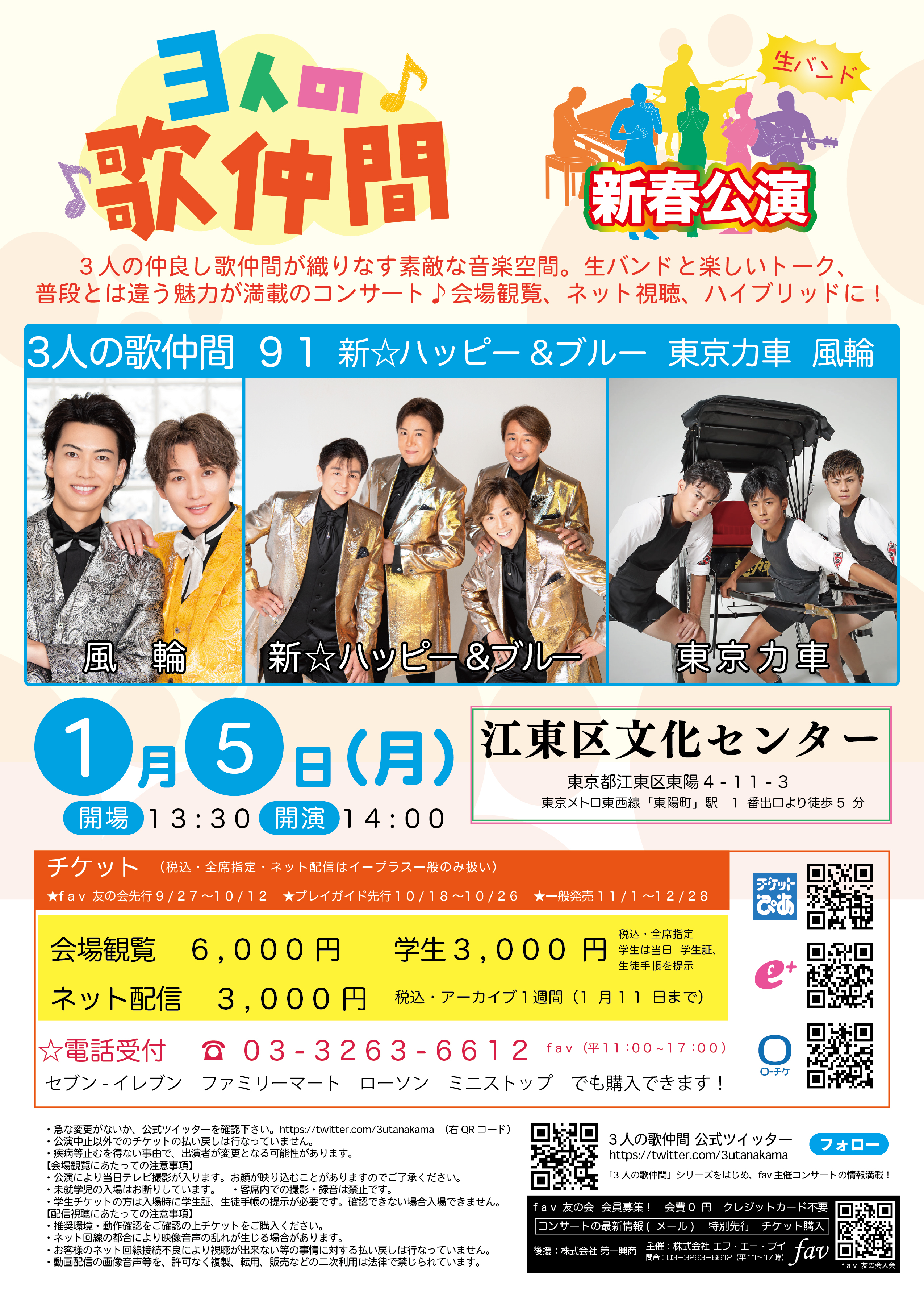 3人の歌仲間 公式ツイッター on X: "今年もまた、大阪の地にお邪魔します❤️ 3人の歌仲間in大阪💐 今回は以下の2本立て 12時大江裕パク・ジュニョン松尾雄史 16時松尾雄史三丘翔太二見颯一青山新 淀屋橋駅直結 朝日生命ホール! 4月6日 日 11時より fav。
