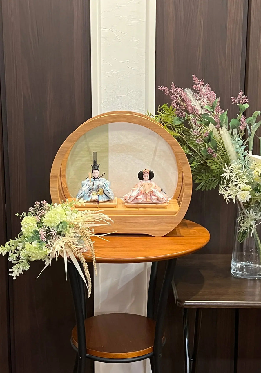 雛人形 コンパクト ケース飾り まどか 芥子親王 三人官女 五人飾り 円形 丸型 アクリルケース飾り 名前・生年月日入り敷き布セット 平安道翠HNMT-6103BZ07おひなさま お雛様 ひな人形 かわいい おしゃれ インテリア モダン 雛 ケース飾り ケース人形の丸富。