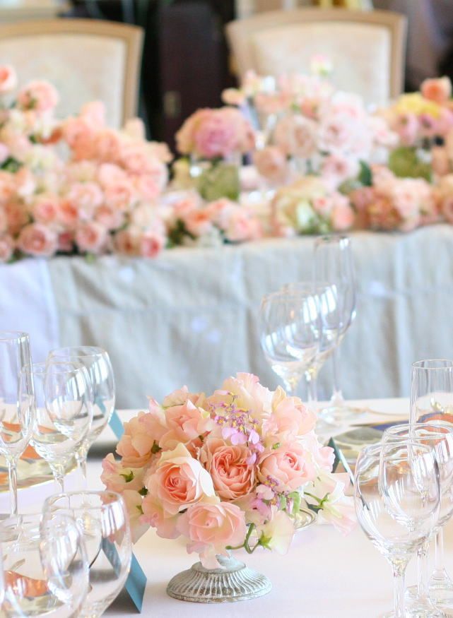 卓上装花 桜色 3月、シェ松尾天王洲倶楽部様の装花一会 ウエディングの花。