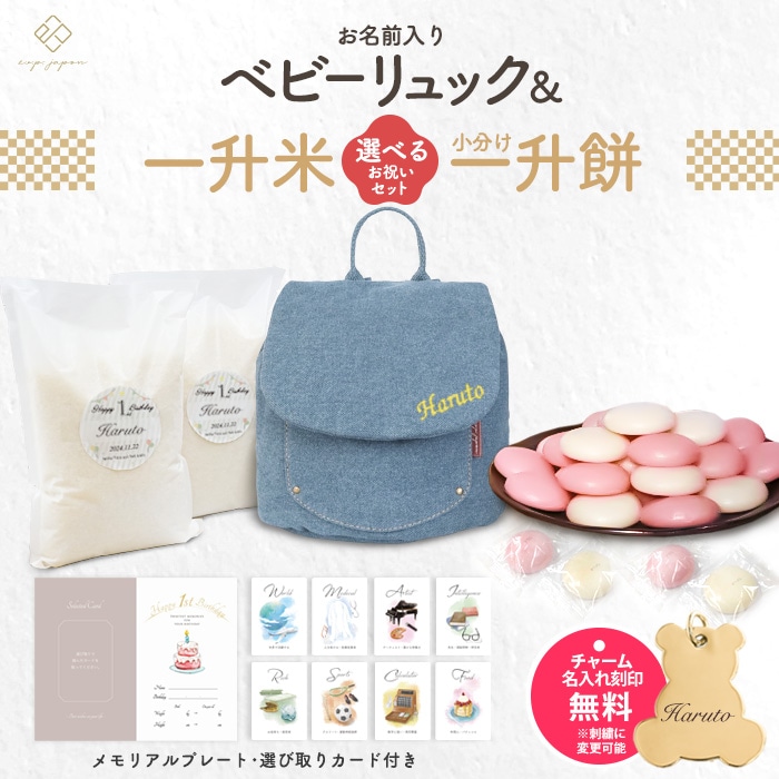 名入れ 一升餅セット ぷっくりリボンのベビーリュック ベビーギフト おしゃれ 日本製 ベビー用品 ◇ハンドメイド 背負い餅用リュック心のこもった贈り物 出産祝い 誕生日 1歳 クリスマスプレゼント ギフトボックス無料!0014set -coco plus an factory。