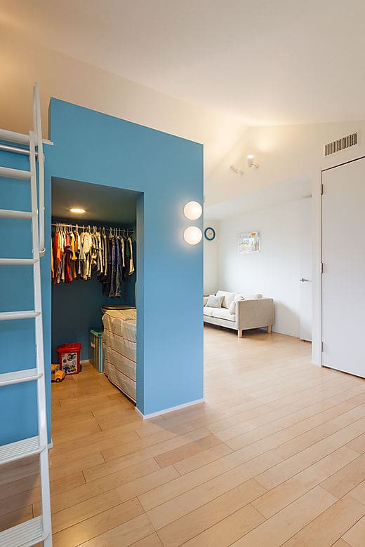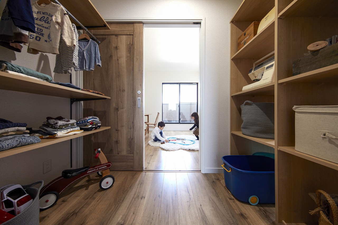 子供部屋には部屋を広く見せつつたくさんの収納ができるウォークインクローゼット - 事例写真「和モダン深い軒・庇のあるここちいい家」注文住宅のハウスネットギャラリ。