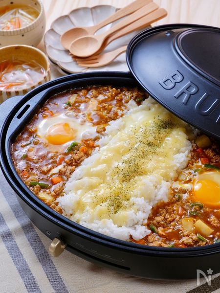 子供も大人もみんな大好きな三色丼をホットプレートで完全再現✨ ホットプレートひとつで簡単に作れて見栄えも可愛い😍 作るところから楽しめる一品です✨レシピ本には他にもホットプレート一つで簡単に作れるレシピを。