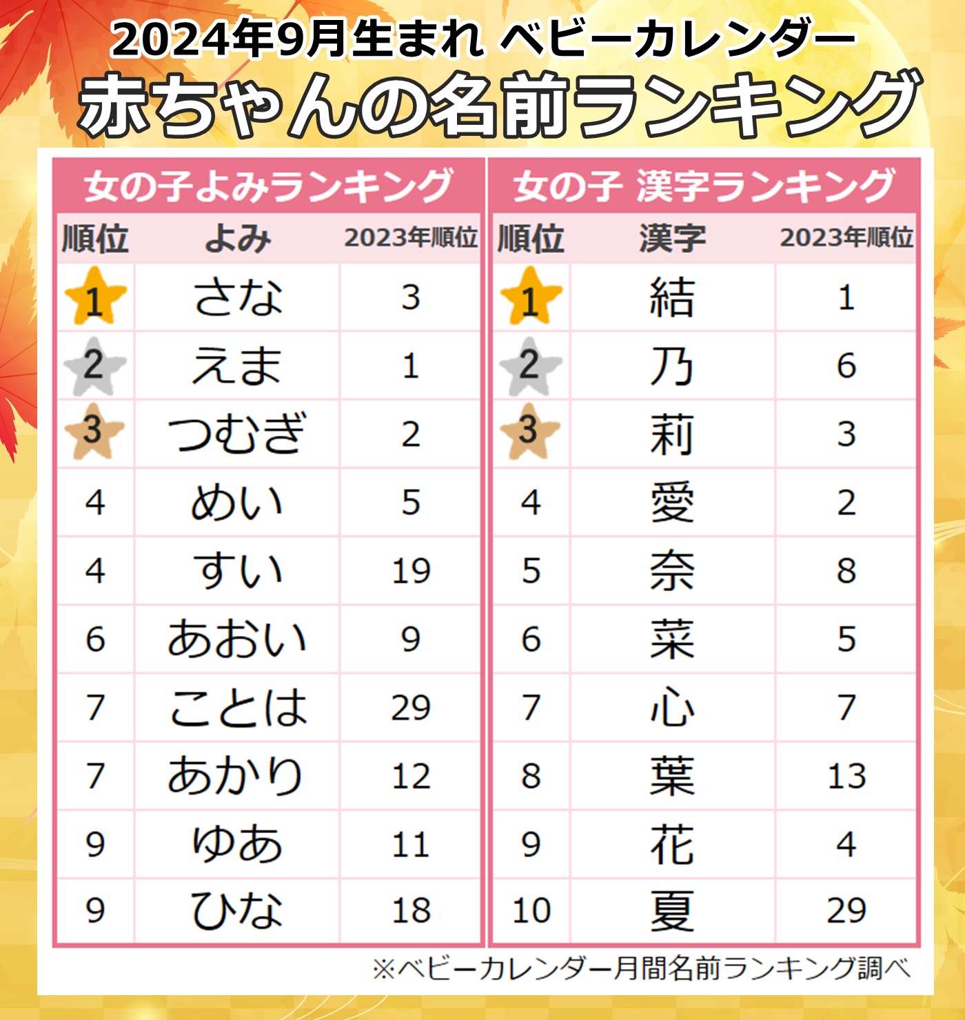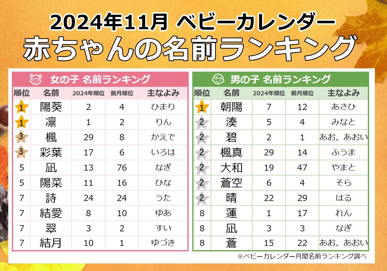 色鮮やかな紅葉をイメージする「紅葉ネーム」増加!実りの秋にまつわる名前「ハーベストネーム」が人気上昇!2024年『11月生まれベビーの名付けトレンド』発表株式会社ベビーカレンダーのプレスリリース。