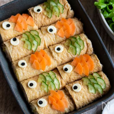 その他はインスタから→ @yuchi__gohan こどもの日と言えば鯉のぼり〜🎏 こどもの日のおもてなしに鯉のぼいなり 勝手に名付けた はいかがですか〜🥰用意するもの・いなり揚げ 業務スーパーの1パック15枚入りのもの使用・酢飯→いなり揚げ1パック分の場合 ごはん 2合お酢 大さじ2.5砂糖orラカント 大さじ2.5塩 小さじ1・きゅうり 2〜3センチ。