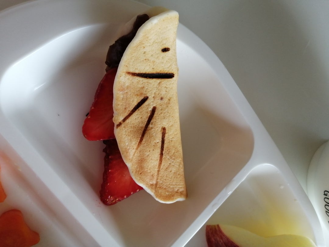 こいのぼりオープンサンド 食パンに生クリームを薄く塗り スライスしたいちごとみかんを乗せる 目はピュアココアとお砂糖とお湯で溶いて 火にかけたもの🎏みんな喜んでくれた🥰 1人だけ4歳の男の子が苦戦していたから 給食室からスプーンを持って 大きくなったら何に。