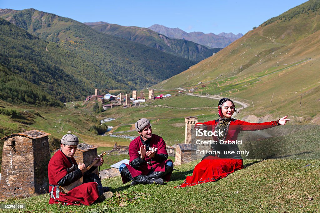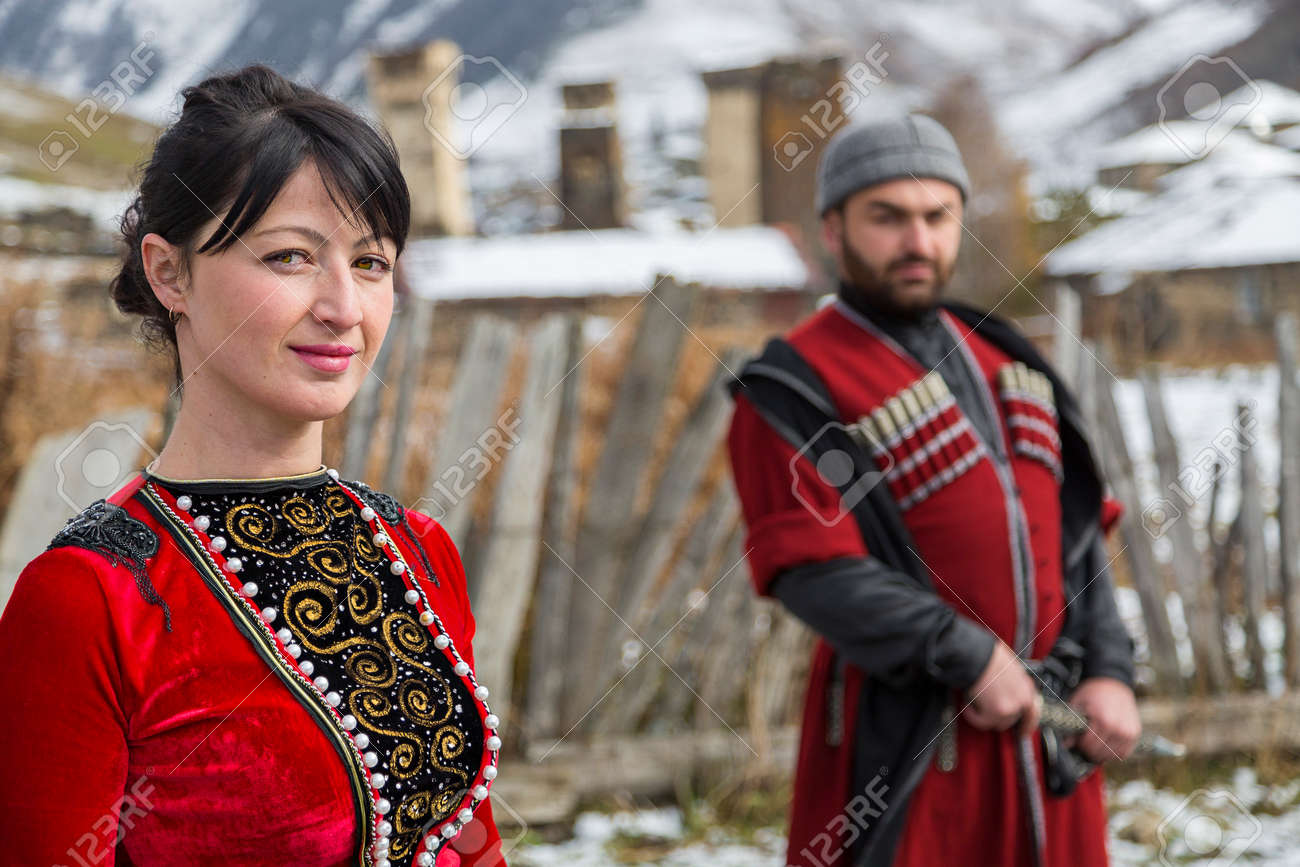 背景に中世の塔があるジョージア州ウシュグリの国民服を着たグルジア人カップル。の写真素材・画像素材 Image 156499114。