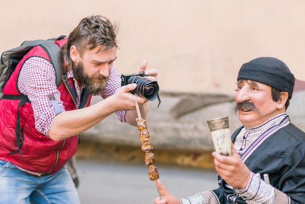 山を背景にブナの衣装を着たグルジア人。選択フォーカス. — ストック写真 © [email protected]。
