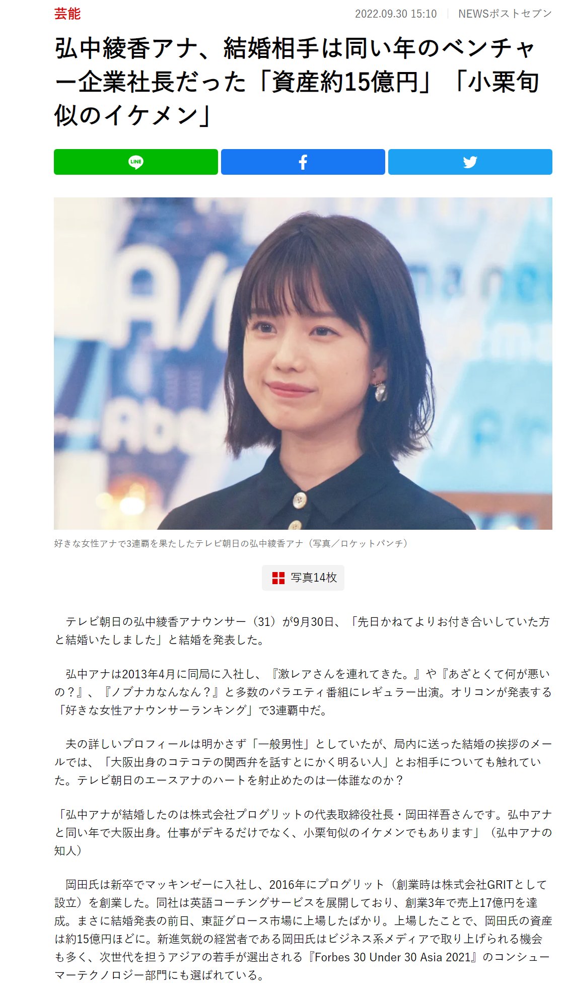 sak on X: "『弘中綾香アナ、結婚相手は同い年のベンチャー企業社長だった「資産約15億円」「小栗旬似のイケメン」』https:t.co SherTaAhkG >弘中アナが結婚したのは株式会社プログリットの代表取締役社長・岡田祥吾さん上場したことで、岡田氏の資産は約15億円。
