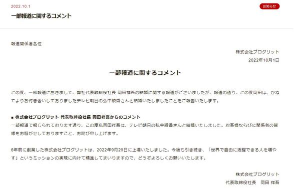 弘中綾香アナの夫が自社HPで結婚正式発表 英語学習サービス「プログリット」岡田祥吾社長よろず〜ニュース。