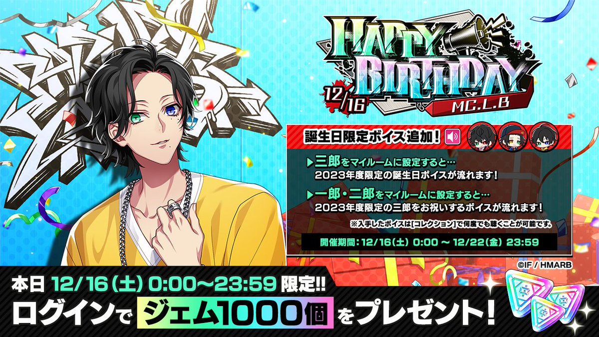 ゲーム ヒプノシスマイク -A.R.B- on X: "\本日限定⚡山田三郎 HAPPY BIRTHDAY ログインボーナス🎁開催中ログインで💎1000ジェム💎がもらえます🎁 さらに✨12 22 木 まで⏰ マイルームに三郎・一郎・二郎を設定すると✨2022年度仕様✨のバースデーボイスが流れます。