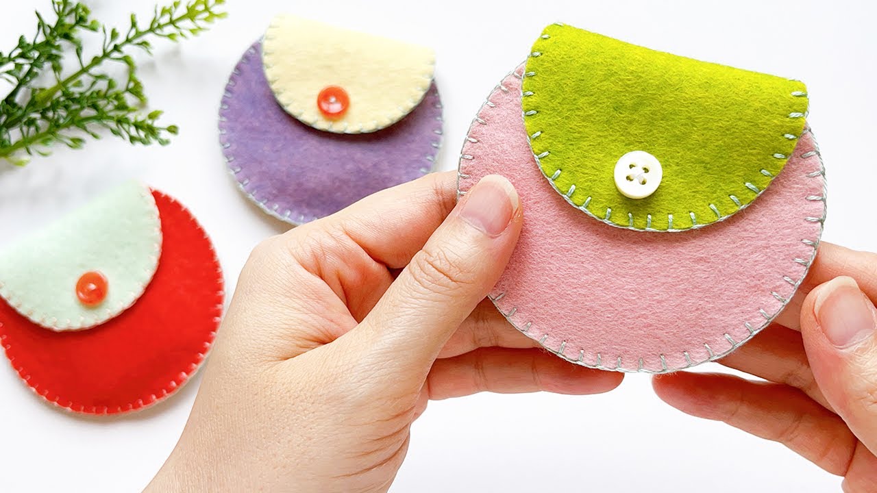 初心者でも簡単 手のひらサイズの丸くて可愛い小物入れ!フェルトのミニポーチの作り方小物作り- DIY Simple Pouch,Purse, Earbud Case。