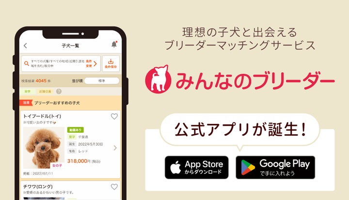 ブリーダーマッチングサイト『みんなのブリーダー』公式アプリをリリース株式会社シムネットのプレスリリース。