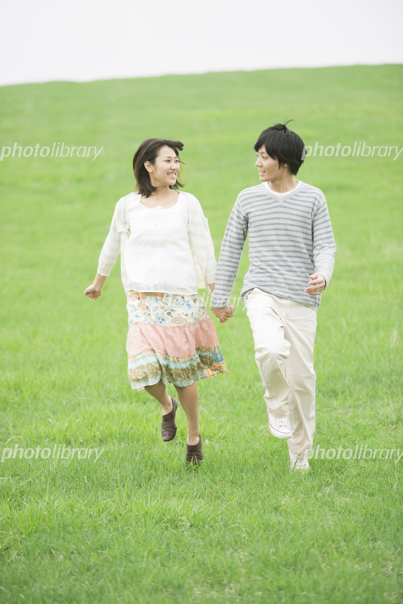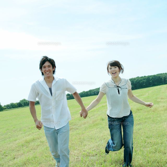 草原で手をつなぎ走るカップル 20027001279 の写真・イラスト素材アマナイメージズ。