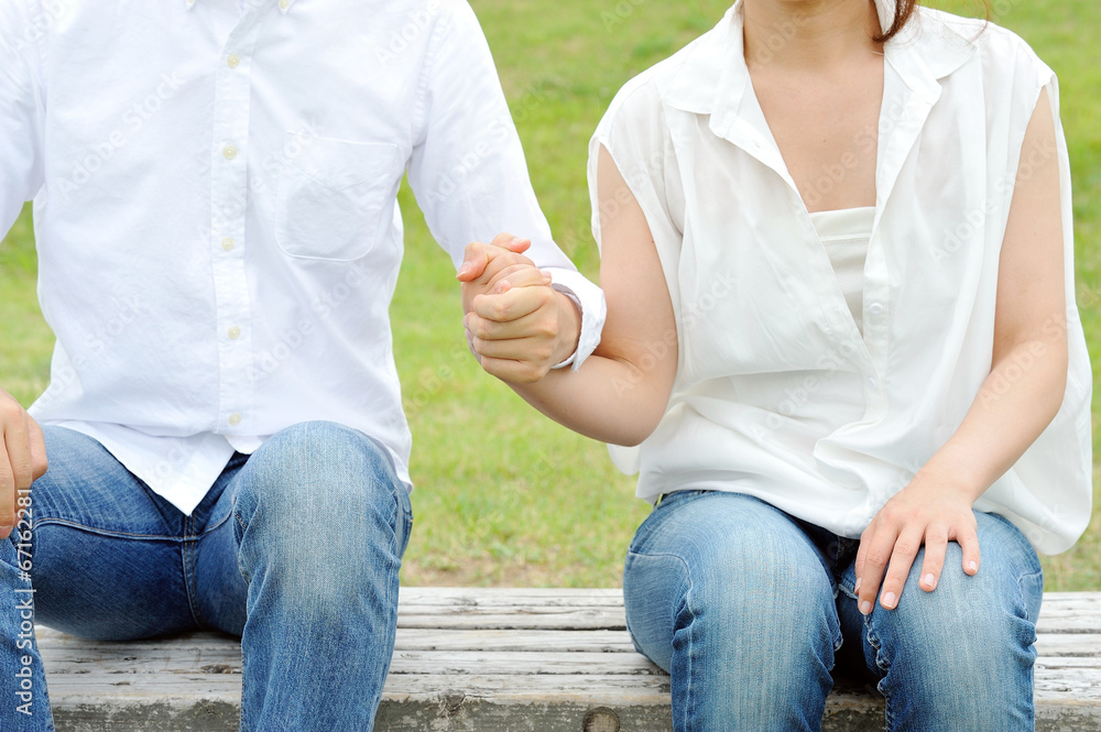 屋外のベンチに座って手をつなぐカップル Stock PhotoAdobe Stock。