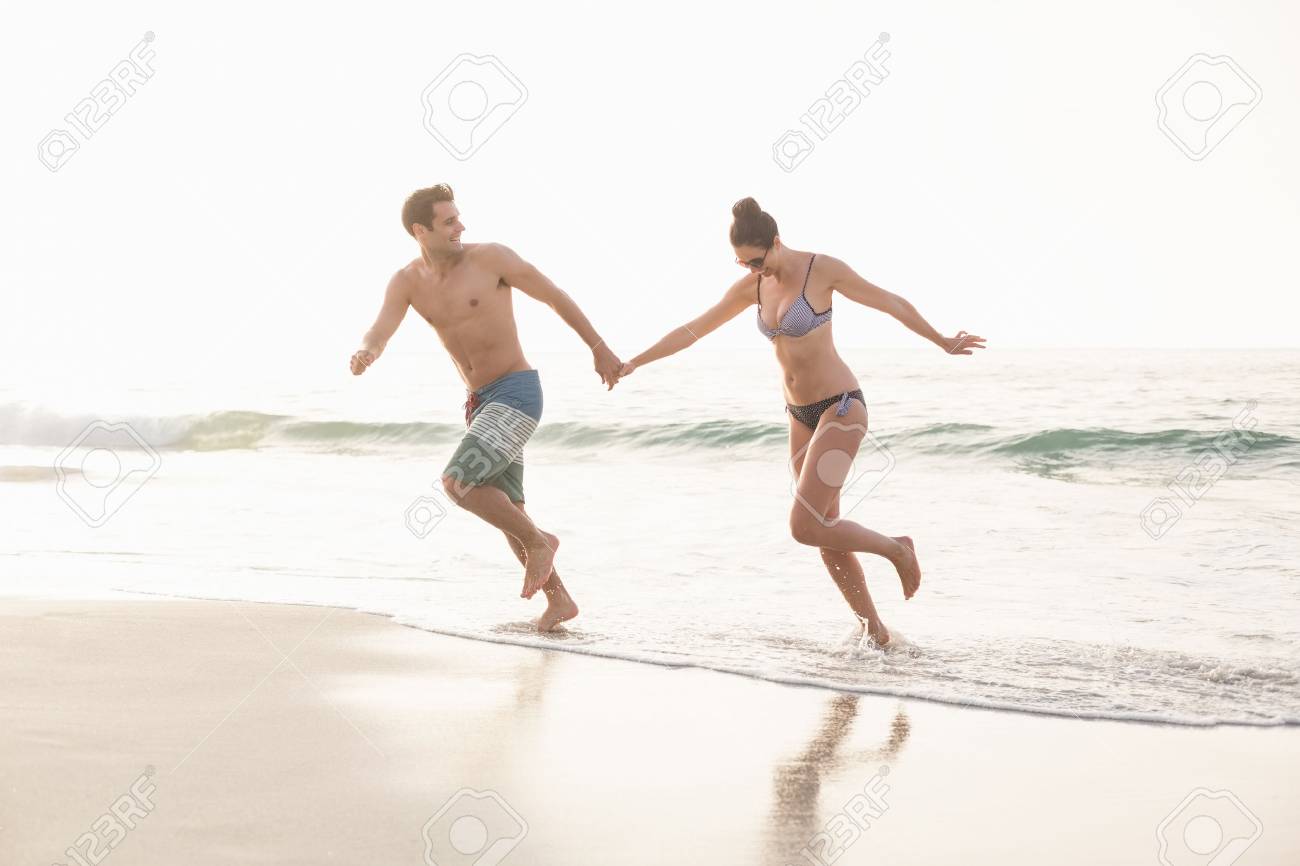 手を繋いでいると、ビーチを走る幸せなカップルの写真素材・画像素材 Image 54488371。