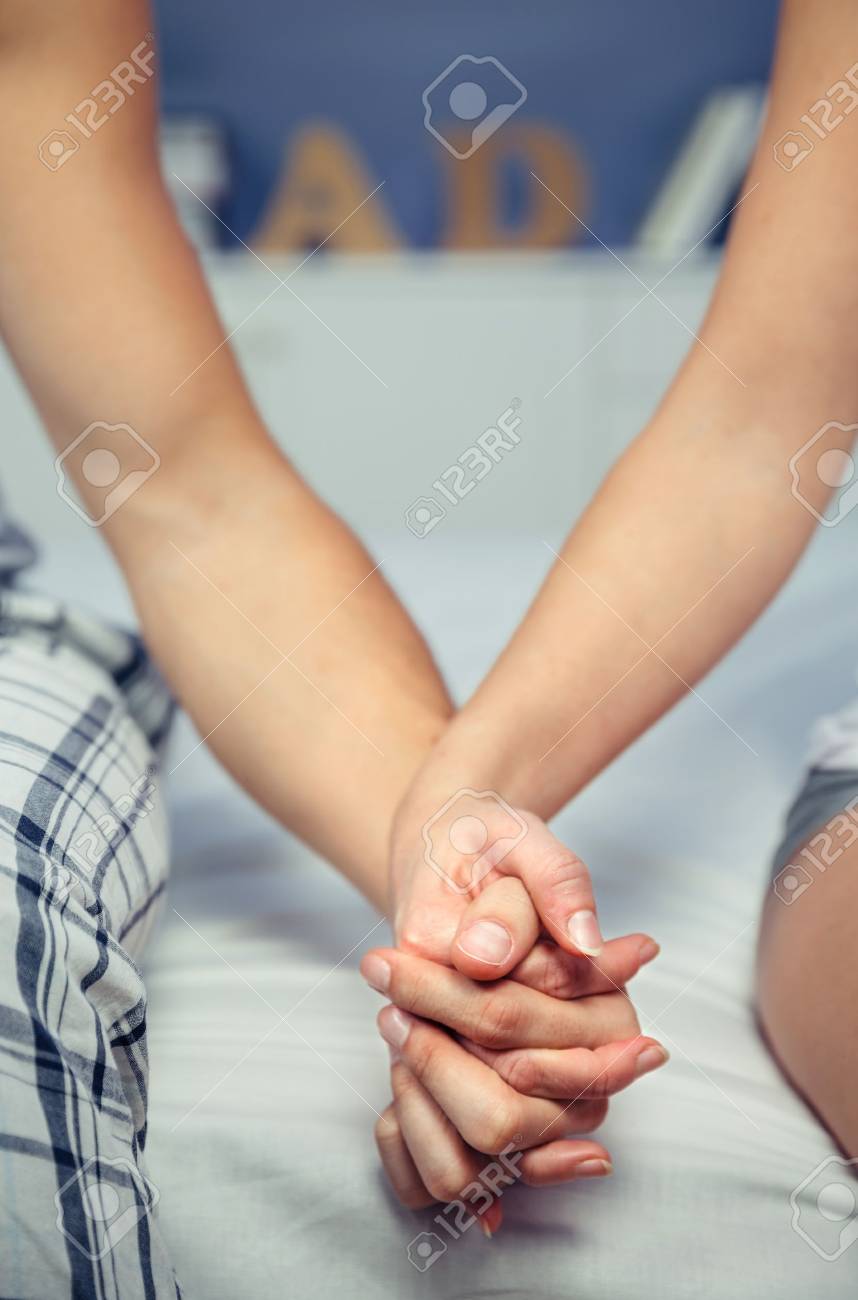 ベッドの上に座って手を繋いでいるカップルの写真素材・画像素材 Image 69267968。