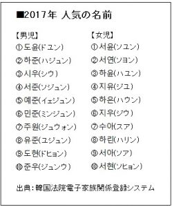 2017年 韓国で人気の名前ベスト10☆ ソウルの空の下で ☆。