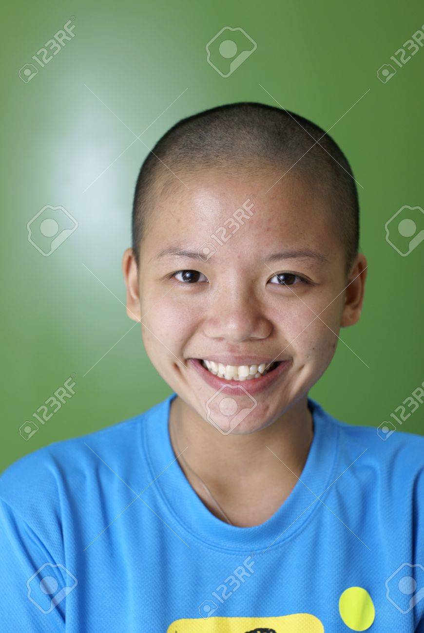 ちょうど坊主頭と髪の顔の上の粒子との幸せな女性の写真素材・画像素材 Image 9264075。