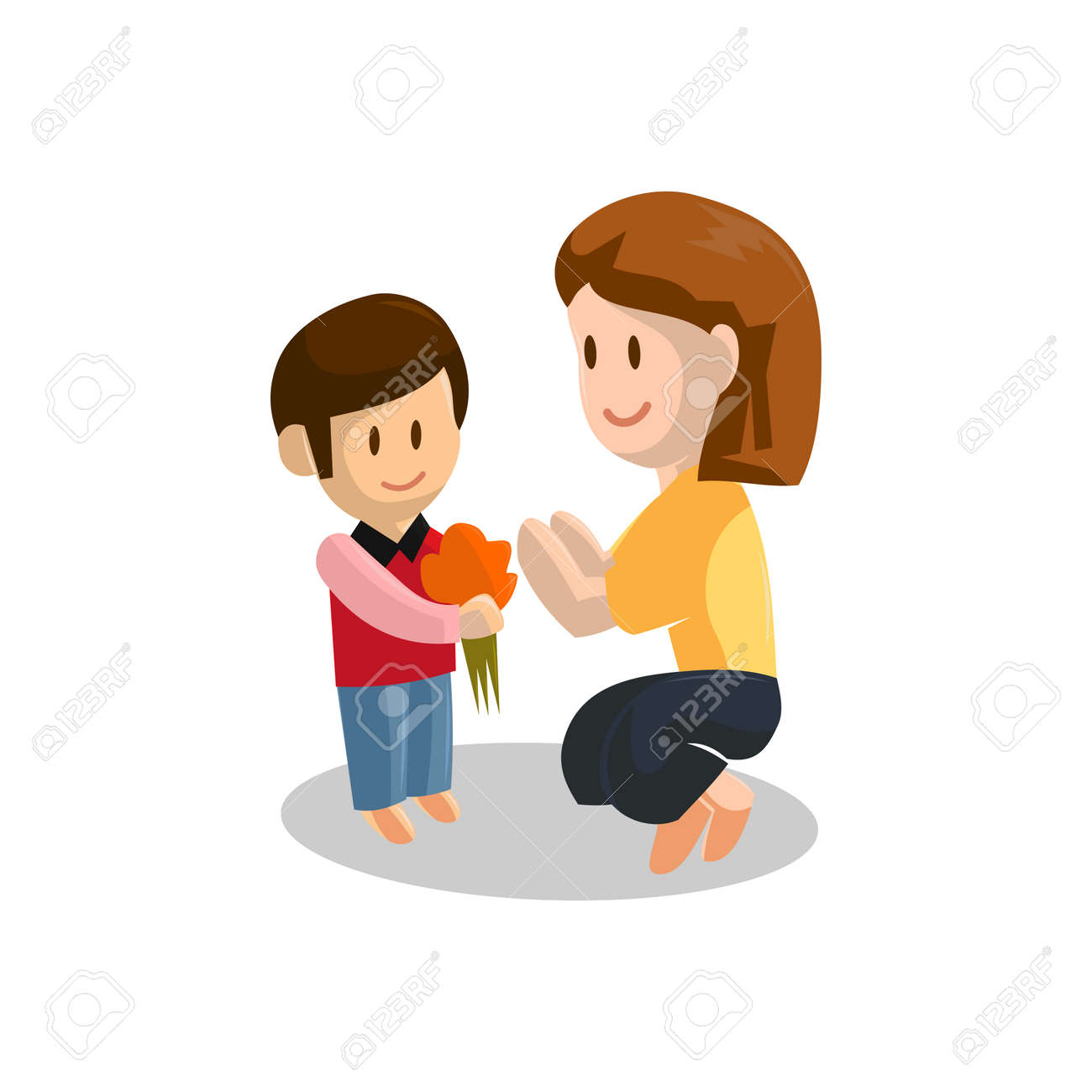 息子は若い母に花をあげます。ママと息子との幸せな母の日のコンセプト。ベクトルイラストのイラスト素材・ベクター Image 163636485。