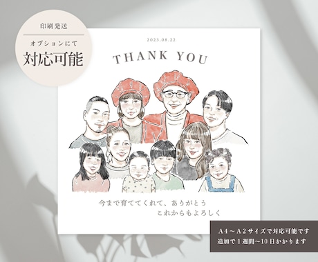 感動のサプライズギフト 家族の絆を似顔絵色紙に 家族の絆を似顔絵色紙に残す特別なギフトです。写真から似顔絵に仕上げる手描きのかわいい似顔絵 イラストで、大人数の家族にぴったりです。贈り物やプレゼントとして人気で、特別な記念の一枚として喜ばれます。いつき。