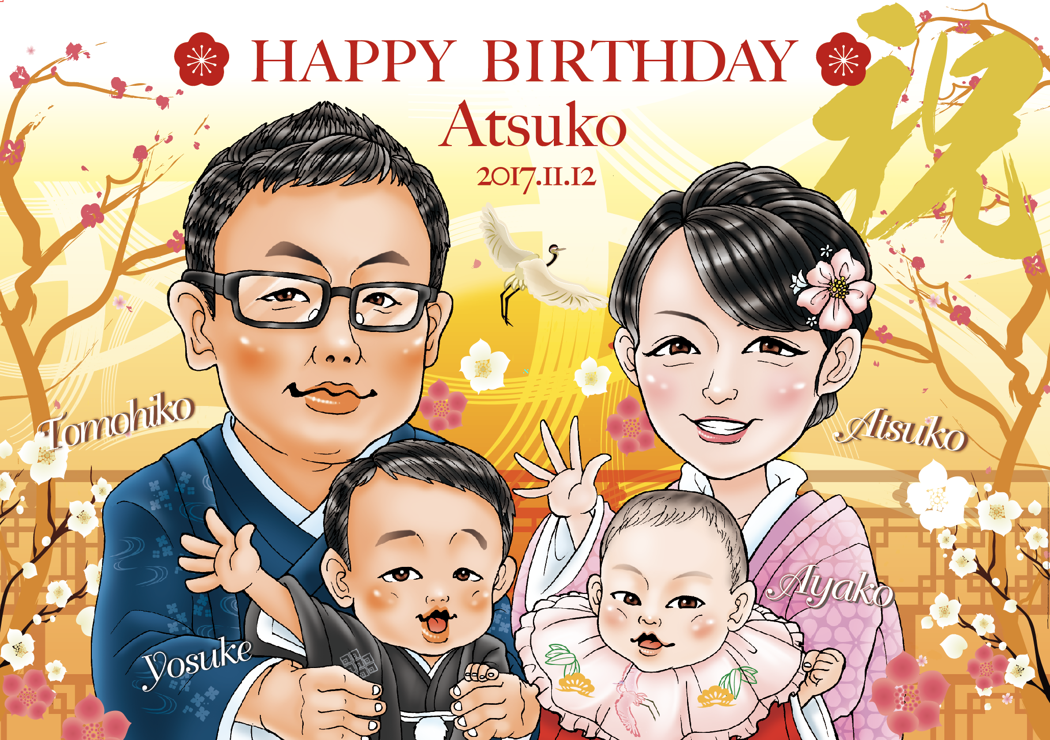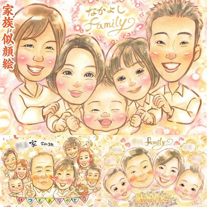 似顔絵 家族 ファミリー 大人数 お祝い 記念 プレゼント ギフト 子供 成長記録 女性に人気の似顔絵。家族の記念写真風の似顔絵 あきよ -似顔絵プレゼント お祝い似顔絵おむすび - プレゼント&ギフトのギフトモール。