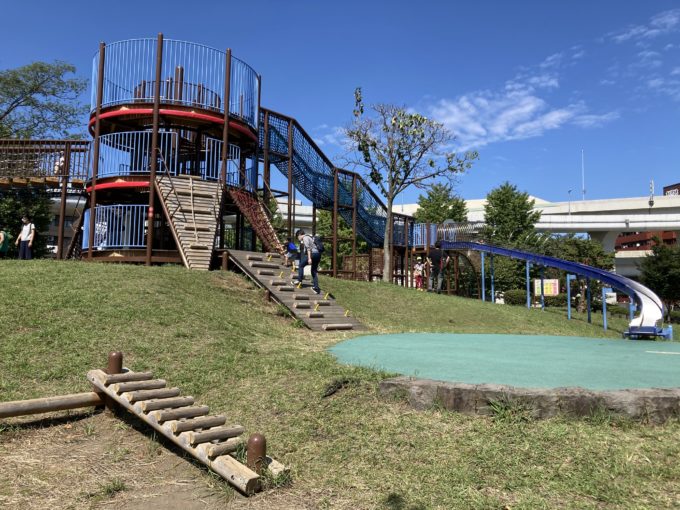 蒔田公園 まいたこうえん :巨大遊具「どんぐりとりで」のある公園で遊んできました!小学生、幼児も満足の遊具あり。首都高を走るクルマや飛行機も見渡せる公園です。駅からも徒歩で行けます。 ママレポ2022年横浜・湘南で子供と遊ぶ - あそびい横浜・湘南。