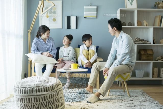 リビングで話す幸せな家族の団欒風景 10626004085 の写真・イラスト素材アマナイメージズ。