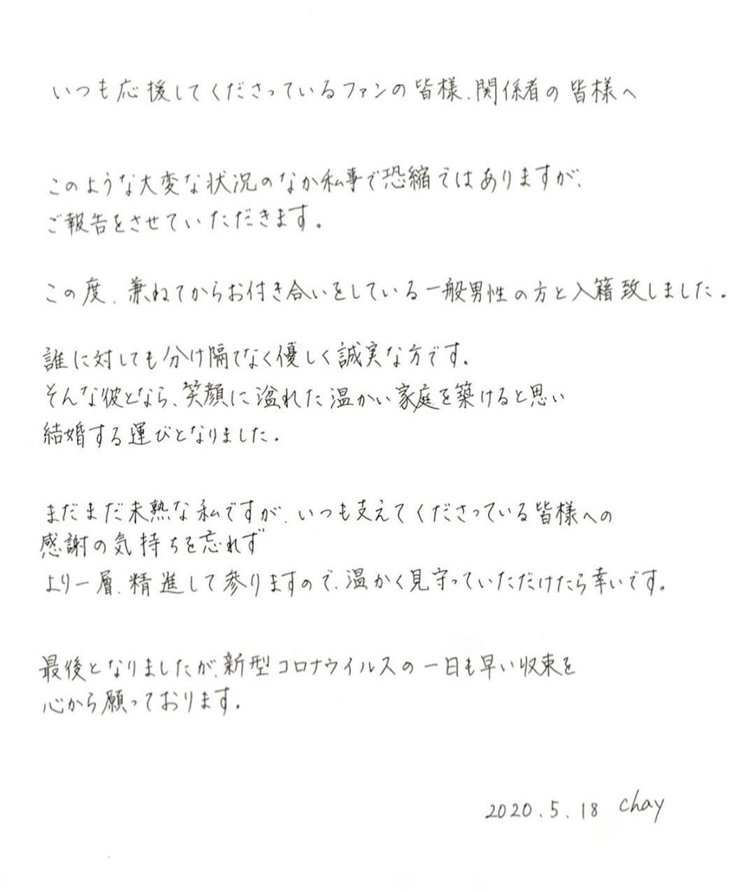 chayが結婚、相手は一般男性。永谷園創業者一族の令嬢が恋人と入籍、CanCam表紙でウェディングドレス姿披露今日の最新芸能ゴシップニュースサイト芸トピ。